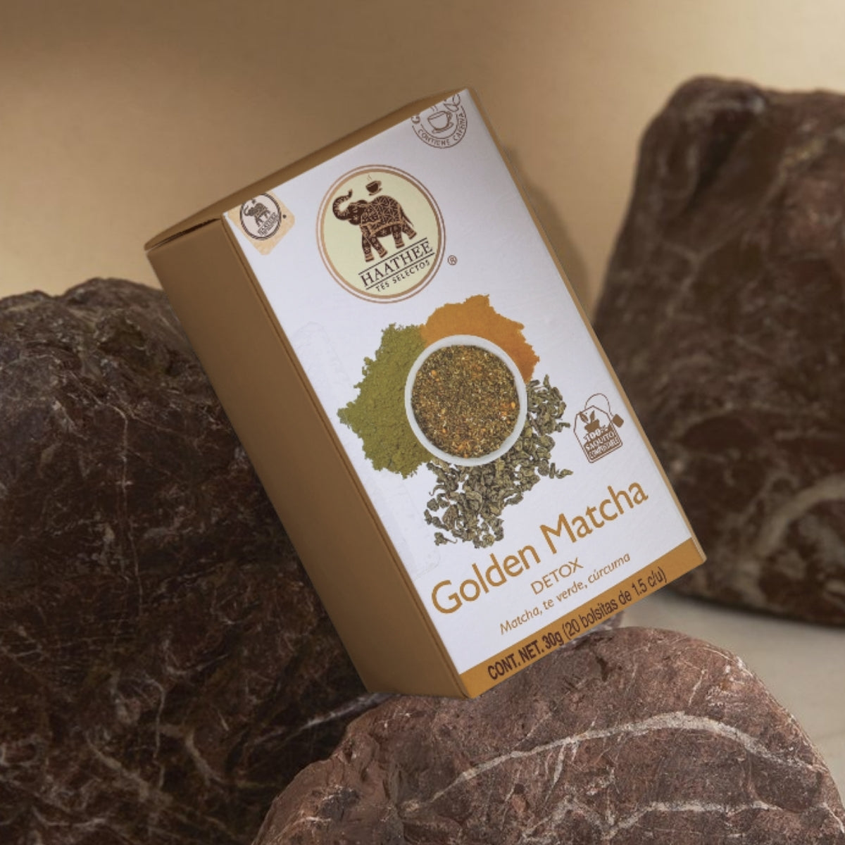 (Matricaria chamomilla), matcha (Camellia sinensis), cúrcuma (Curcuma longa), raíz de jengibre (Zingiber officinale).