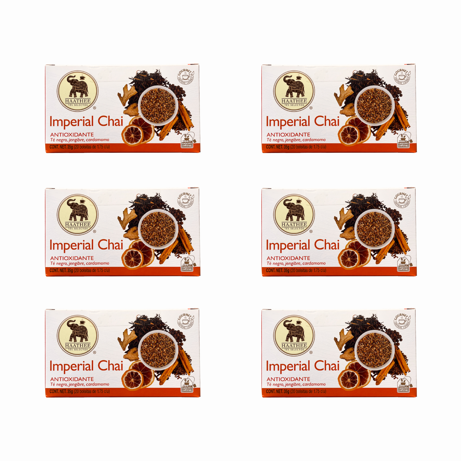 - Imperial Chai: Mezcla premium de clavo, cardamomo, jengibre, canela, té negro y pimienta.