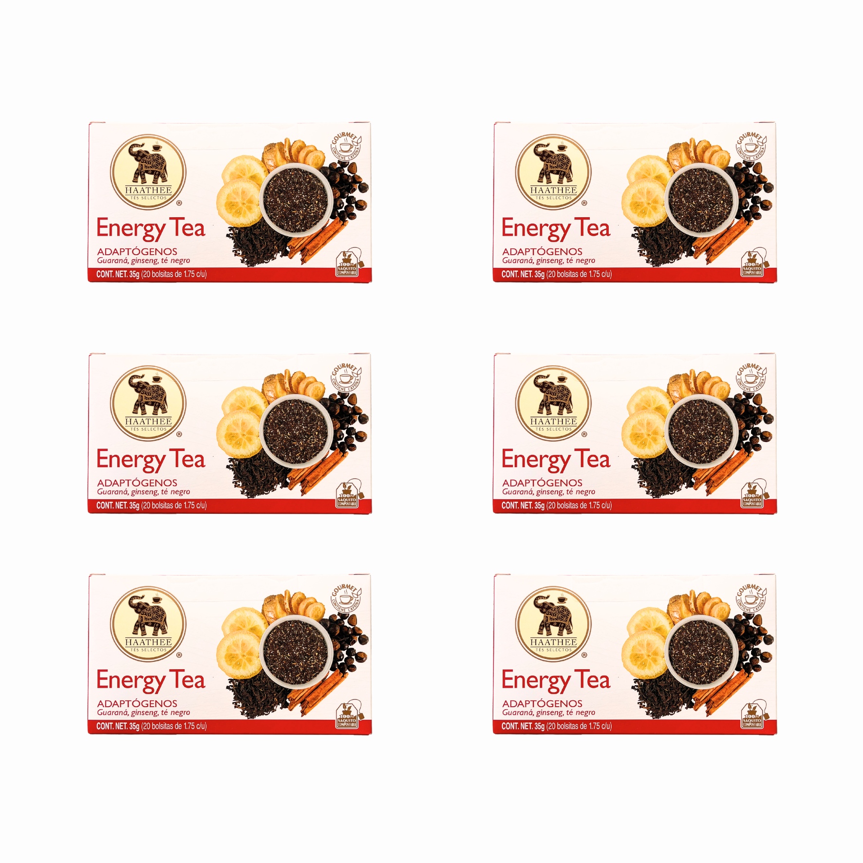 - Energy Tea: Fórmula con adaptógenos de guaraná, ginseng, té verde, lima y canela.