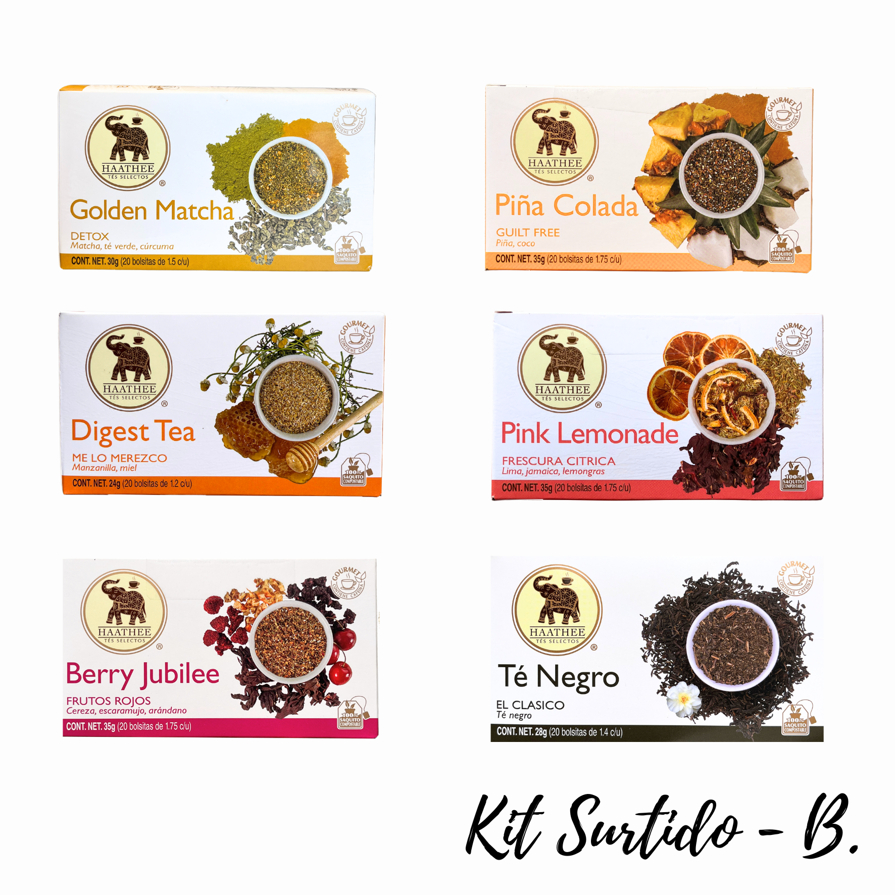 - Kit Surtido B: Pack con cajitas de los sabores Golgen Matcha, Piña COlada, Digest Tea, Pink Lemonade, Berry Jubilee, Té Negro.