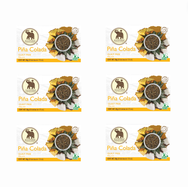 - Piña Colada: Mezcla tropical con té verde, coco, piña, manzana verde, cúrcuma y extracto de té verde.